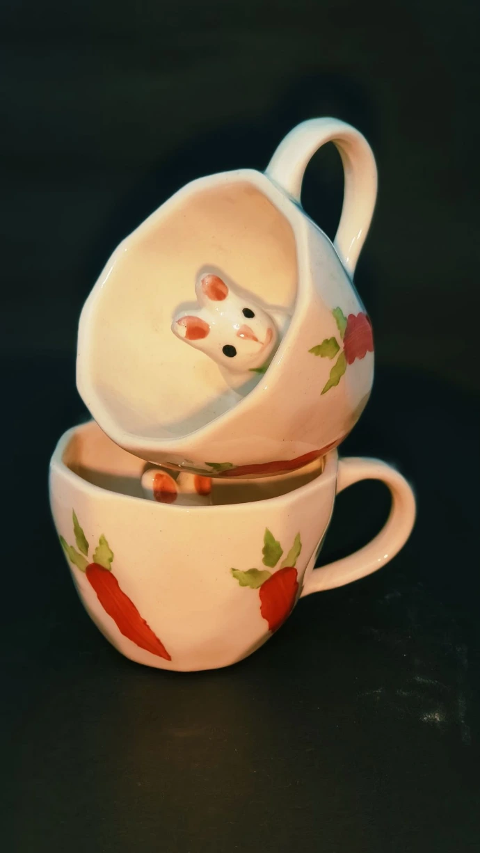 A delightful novelty mug featuring a hidden rabbit figure inside and hand-painted strawberry artwork on the exterior. A unique and joyful piece loved by children and collectors alike.