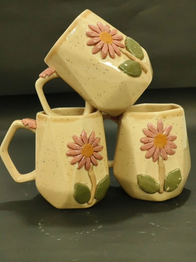 Handcrafted ceramic mugs with embossed sunflower designs and speckled glaze finish. These mugs bring a cheerful and rustic feel to your beverage experience.