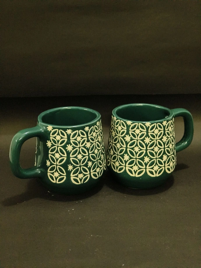 A bold ceramic mug featuring an intricate geometric floral pattern in green and white. Designed with a sturdy handle and smooth glaze, perfect for modern and traditional table settings.