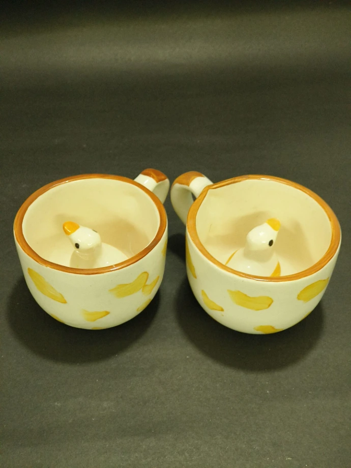 An adorable ceramic mug with a duck figurine inside and hand-painted yellow patterns. A fun and creative design that surprises with every sip.