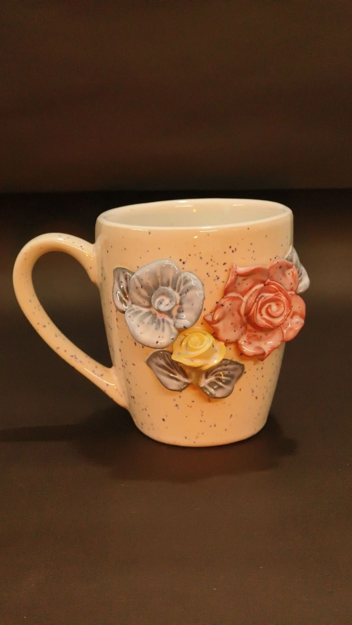 A beautifully sculpted ceramic mug decorated with raised floral motifs in soft pastel shades. Finished with a glossy glaze for a refined and elegant look.